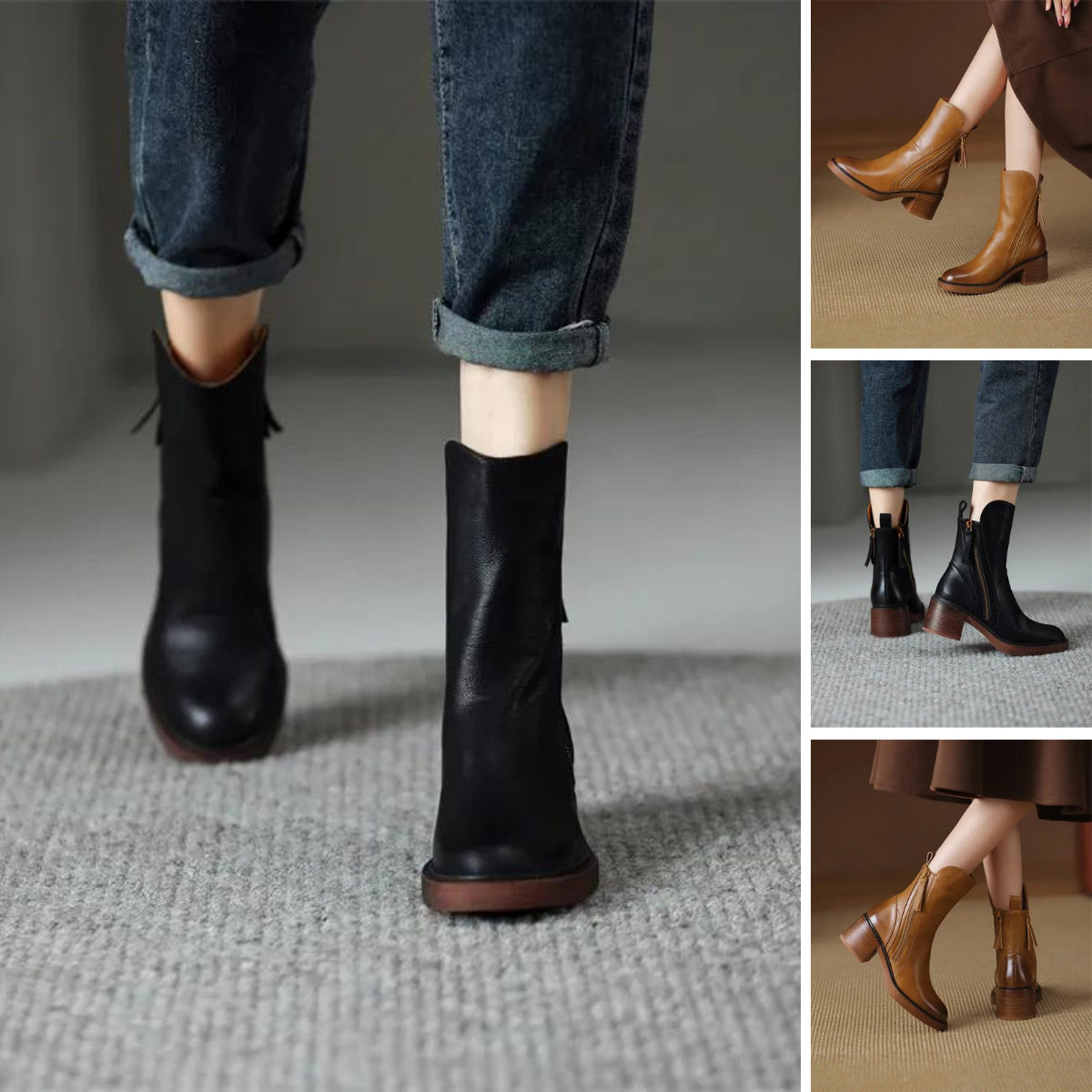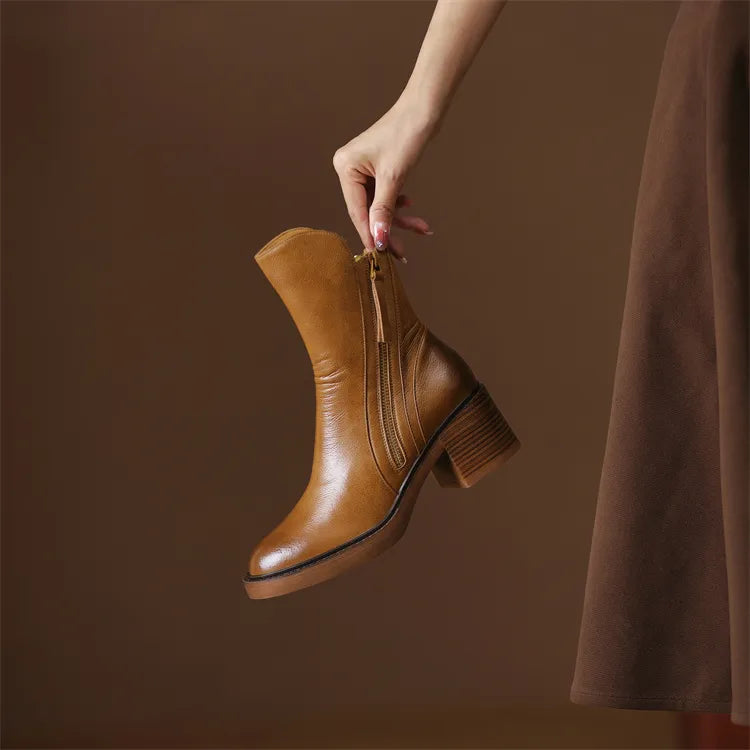 Mabel - The Fashion Round Toe Thick Heel Leather Boots