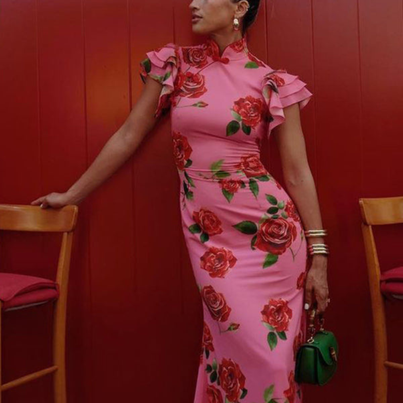This charming maxi dress effortlessly exudes elegance with its bold floral print, making a striking impression. The tiered flared sleeves and high neckline add a touch of style and sophistication, enhancing the overall design. Its floor-length cut creates a sleek, elongated silhouette that flatters the figure. The floral print adds a captivating, nature-inspired touch with a bold design that makes a fashion statement.
