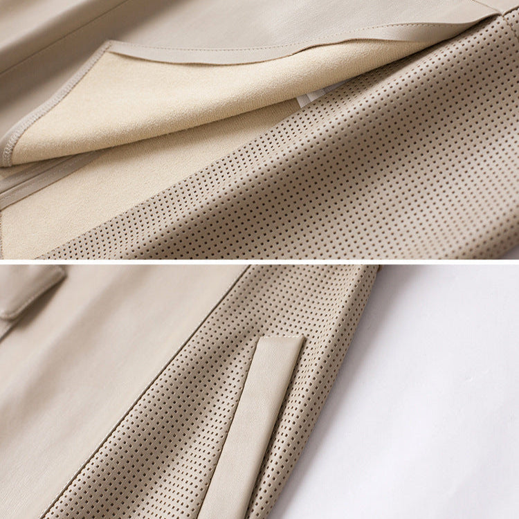 Crafted from supple sheepskin leather, this high-waisted skirt combines smooth and perforated textures in an asymmetrical silhouette. Designed with architectural precision and feminine grace—an evolution of classic leather tailoring reimagined for the modern woman.