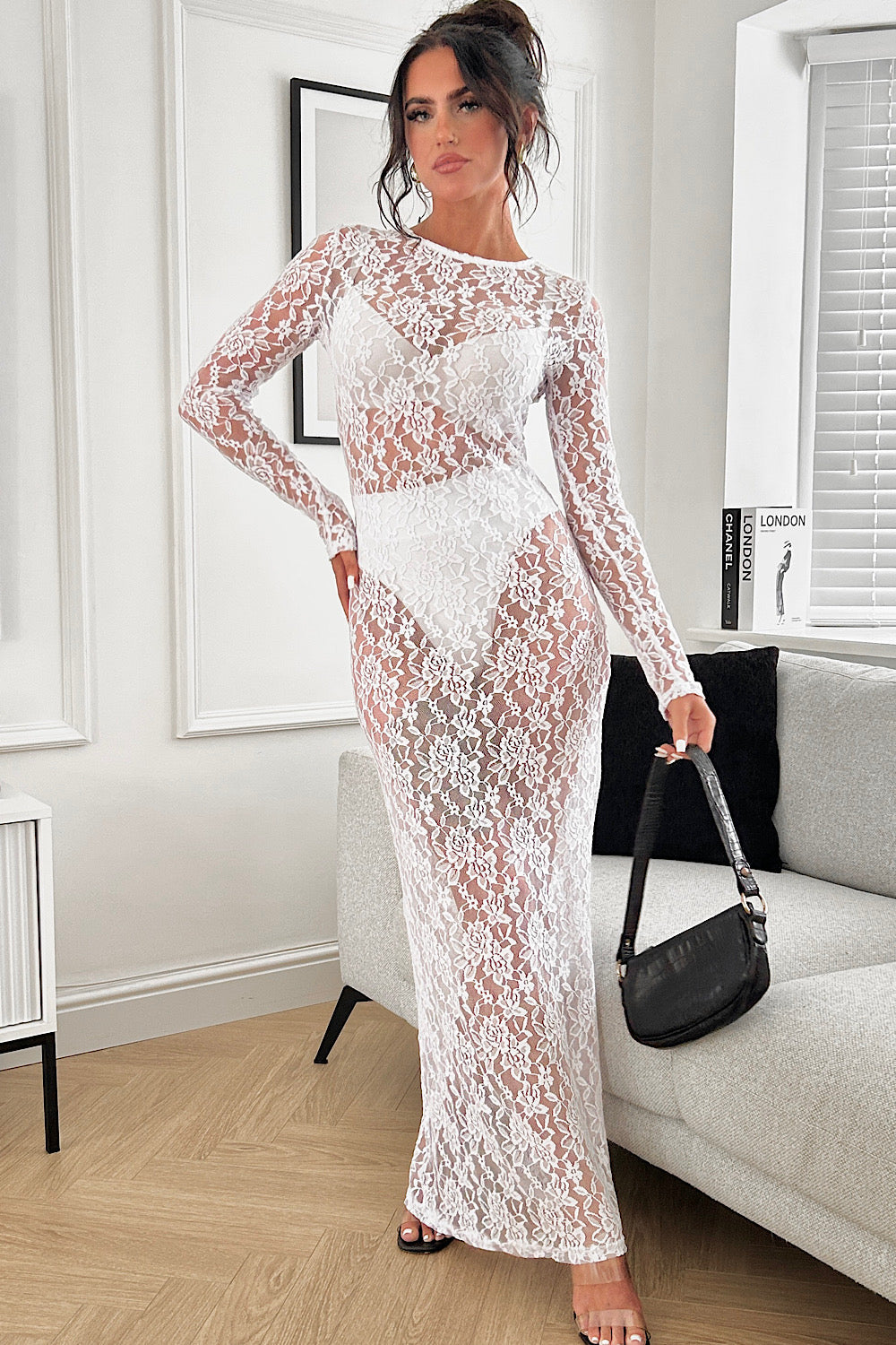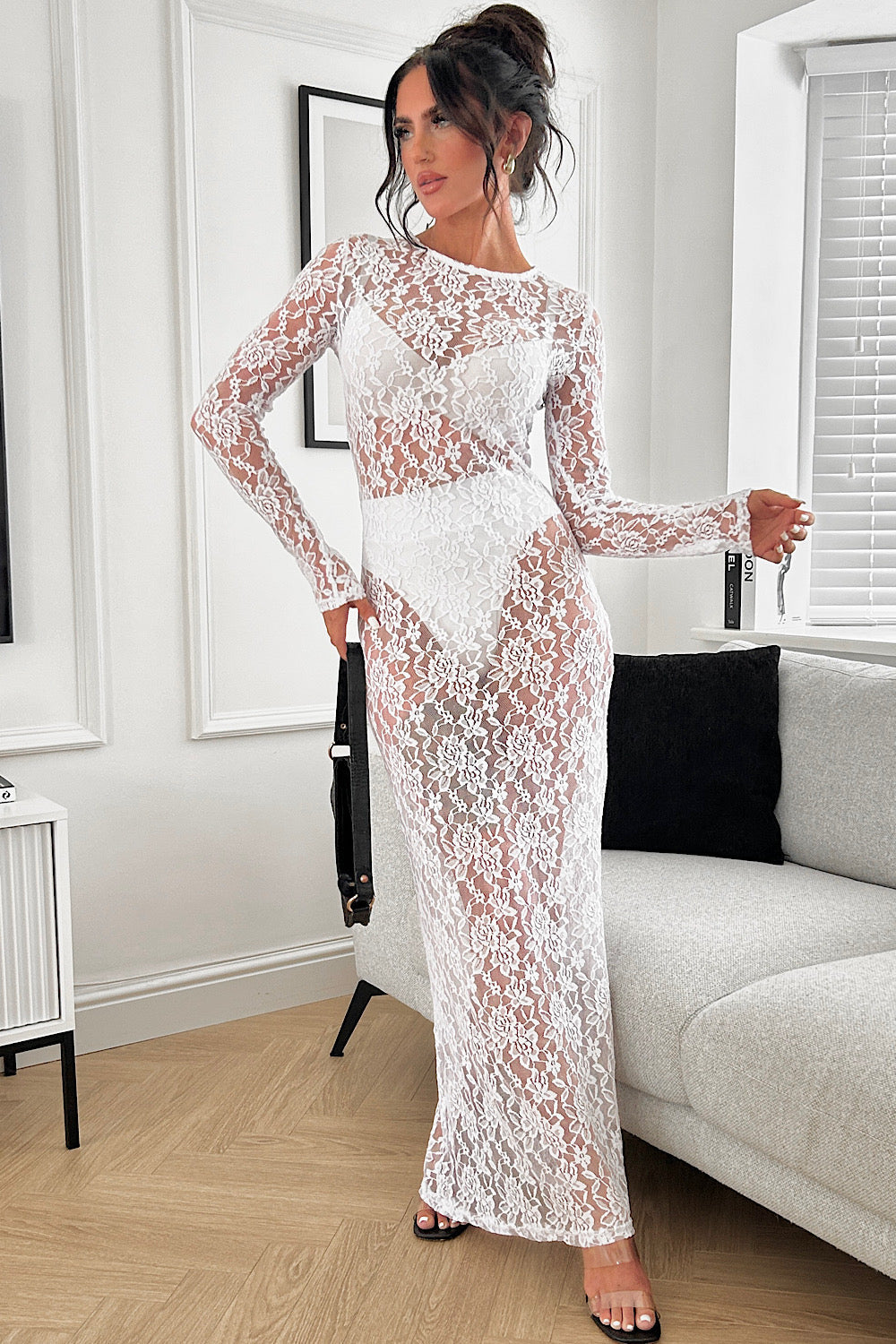 Expertly crafted in delicate lace floral, the Zaria white maxi dress exudes elegance and sophistication. With its intricate design, this dress is perfect for any occasion